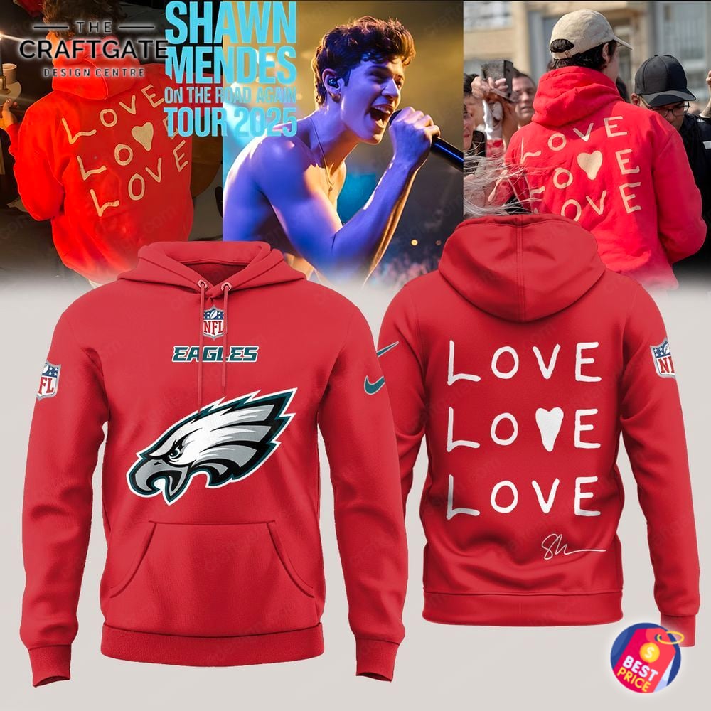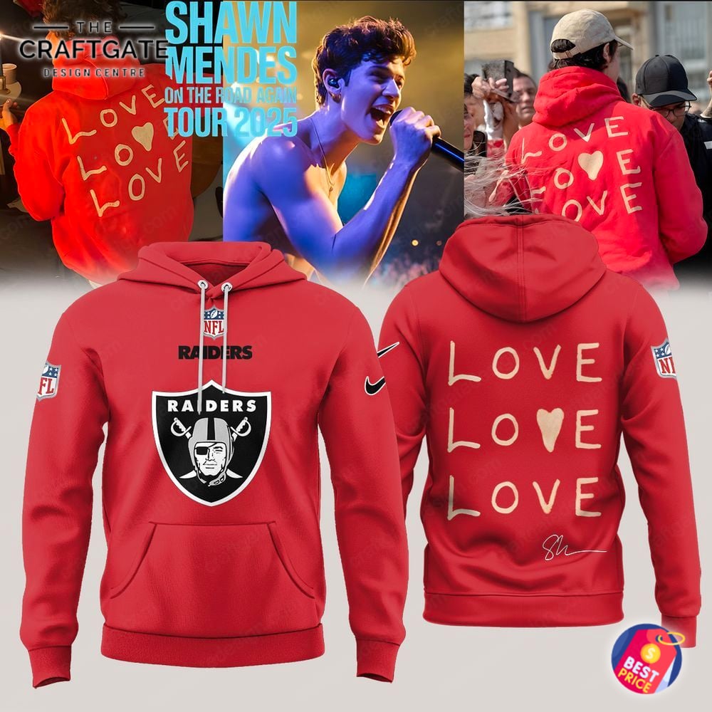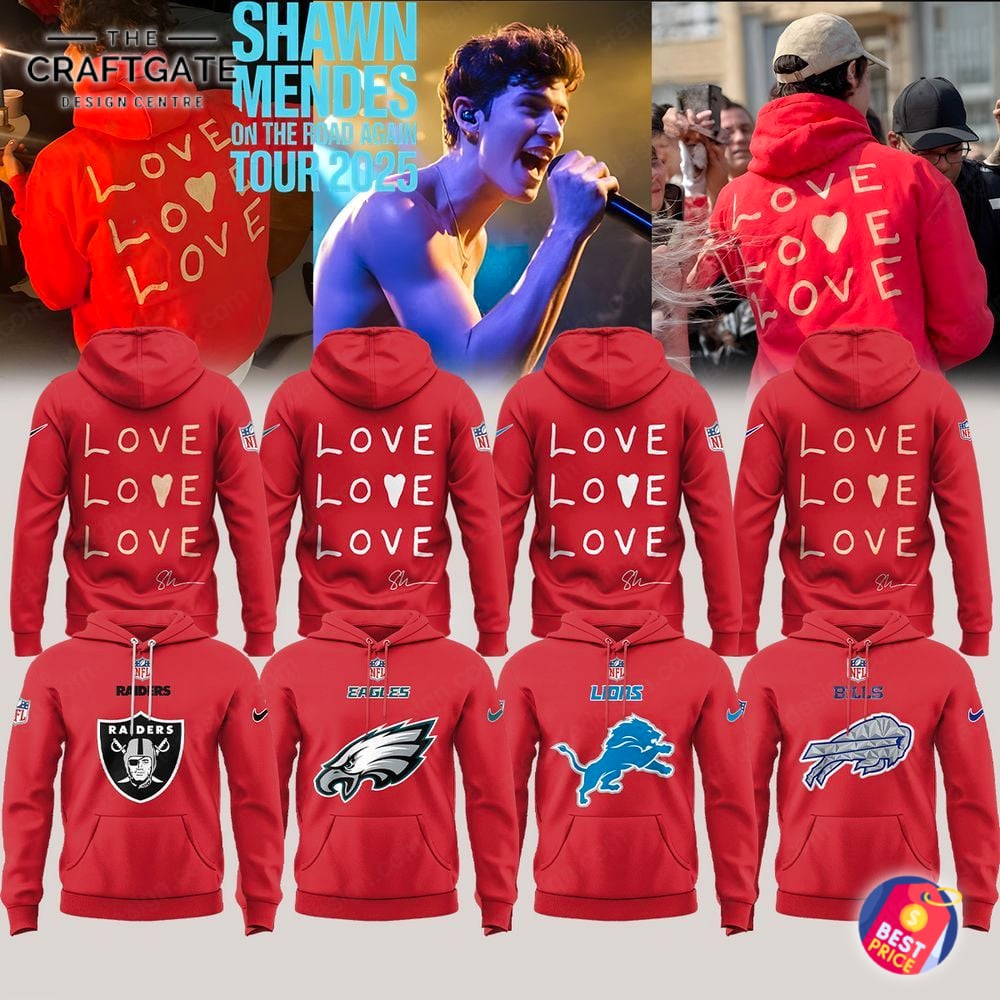 Celebrate your dual passions with the ultimate fan collectible, the All Team NFL x Shawn Mendes On The Road Again Tour 2025 Hoodie. This unique piece masterfully unites the roar of the stadium with the melody of your favorite artist. The front proudly showcases an official NFL shield above your chosen team’s iconic logo and a subtle swoosh on the sleeve. The back features a heartfelt “LOVE LOVE LOVE LOVE” graphic with a central heart replacing an ‘O’, complemented by Shawn Mendes’ authentic “Sh” signature. Crafted from a premium, ultra-soft cotton-poly blend fleece, this vibrant red hoodie ensures maximum comfort and durability.