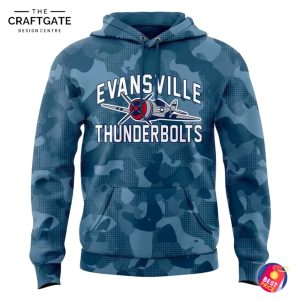 Feel the profound connection to community and country with the Evansville Thunderbolts 2025 Military Night New Hockey Jersey. This striking collectible features a dynamic blue and grey camouflage pattern, embodying a spirit of service. The front proudly displays the “EVILLE THUNDERBOLTS” wordmark alongside a detailed propeller plane emblem, while the back showcases a prominent customizable nameplate and large “00” numbers in bold red with white trim. Crafted from premium, moisture-wicking polyester fabric, designed for durability and comfort, this jersey offers an athletic fit suitable for all fans.