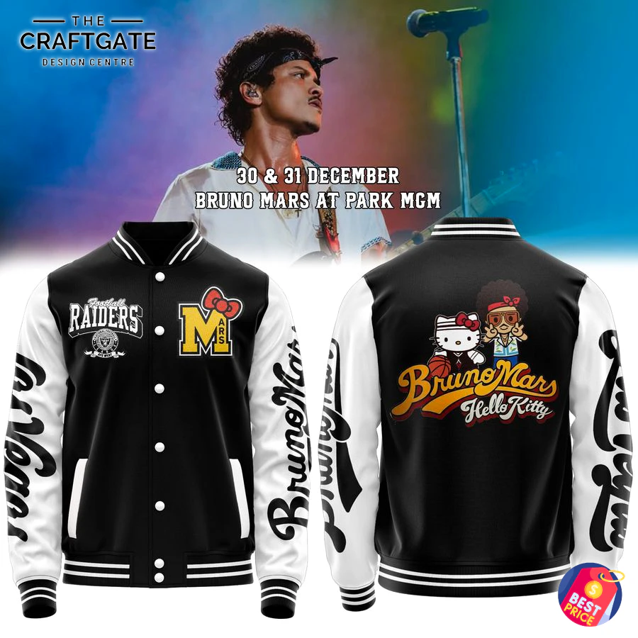 Unite Your Fandom: The Exclusive Las Vegas Raiders x Bruno Mars Hello Kitty Baseball Jacket