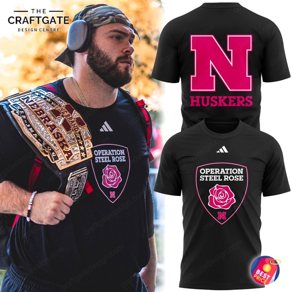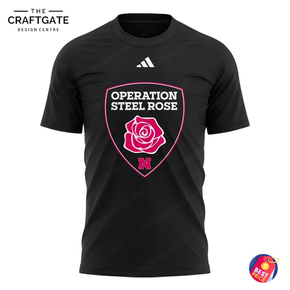 Unite with the Big Red Nation and stand strong for a cause that matters with the Nebraska Cornhuskers Football Breast Cancer Awareness 2025 T-Shirt. This powerful garment features a compelling front design with the iconic logo above a shield emblem, boldly proclaiming “OPERATION STEEL ROSE” around a poignant pink rose and a small “N.” The back proudly displays a large, vibrant pink “N” outlined in white, sitting above “HUSKERS,” all against a sleek black backdrop. Crafted from a premium, breathable 60/40 cotton-polyester blend, this lightweight, standard-fit tee offers superior comfort and durability for everyday wear.