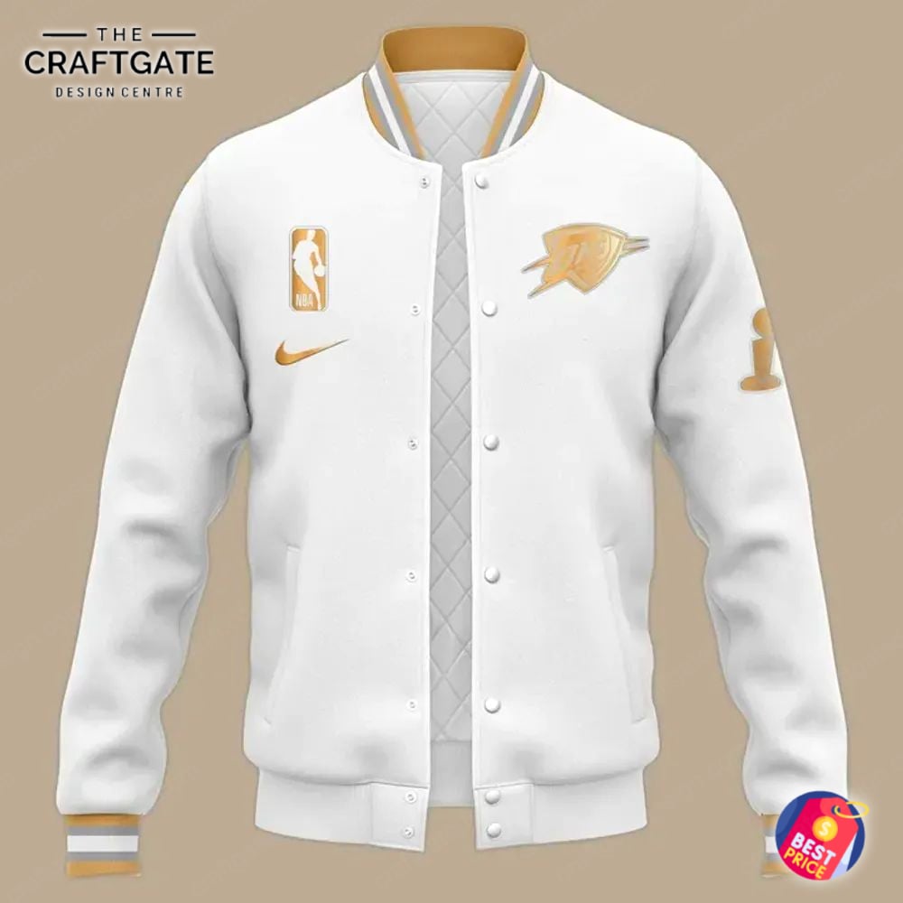 Celebrate the indelible triumph with the official Oklahoma City Thunder’s 2025 Ring Ceremony Jacket, a true symbol of championship glory and a cherished piece of history. This exquisite collectible features a crisp white body adorned with striking gold accents. The front proudly displays the gold NBA logo, swoosh, and a metallic OKC Thunder shield, complemented by a championship “1” on the sleeve. The reverse showcases “NBA CHAMPIONS” encircling the Thunder logo, flanked by “24” and “25,” and “OKLAHOMA CITY THUNDER” below, all in radiant gold. Crafted from a premium polyester blend with a comfortable quilted lining, this medium-weight varsity jacket offers superior quality.