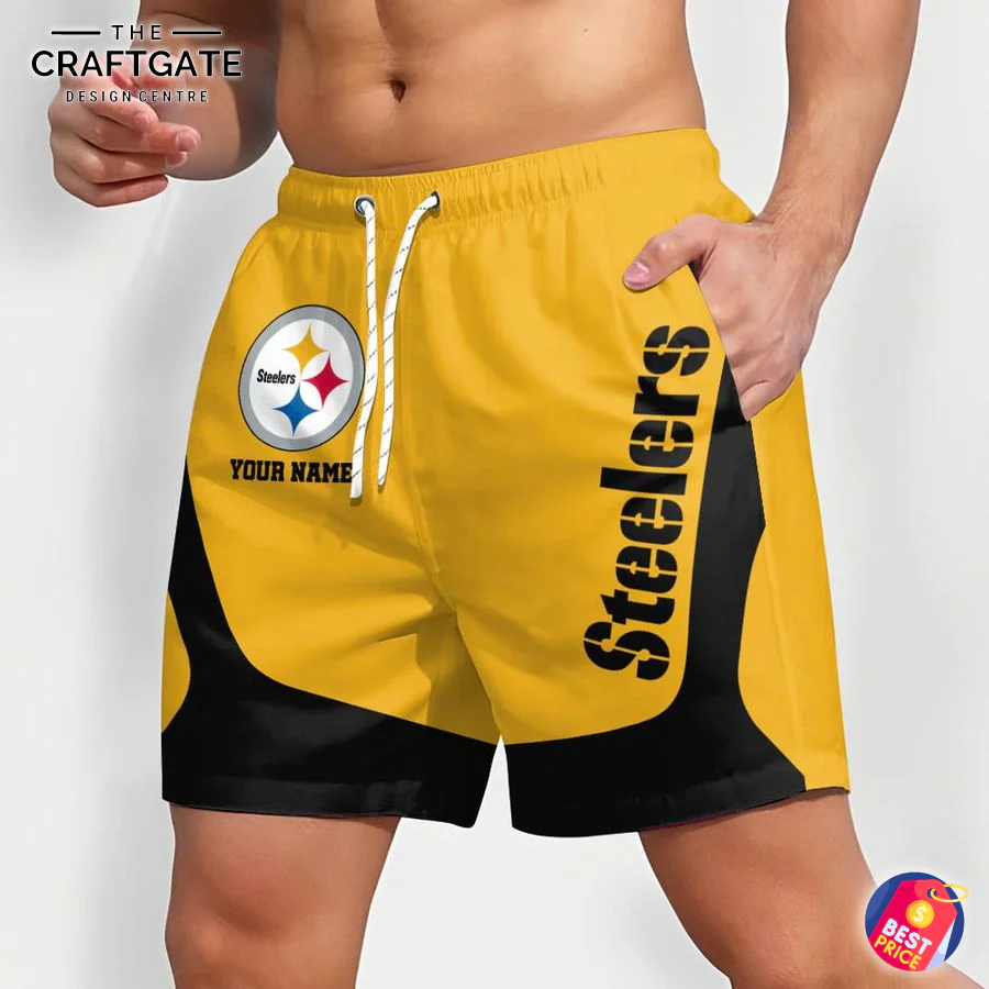 Unleash your inner champion and wear your Steelers pride like never before with the Pittsburgh Steelers Custom Name Special Shorts. This isn’t just apparel; it’s a personal testament to the unwavering passion that defines the Black and Gold faithful. Dominated by the iconic Steelers gold, these shorts feature striking black side panels that create a dynamic, athletic aesthetic. The front proudly displays the legendary Steelers logo—the three hypocycloids symbolizing steel, coal, and iron—expertly positioned above a customizable “YOUR NAME” field, ensuring your personal connection is front and center. Completing the design, a bold, vertical “Steelers” wordmark runs down the leg, leaving no doubt about your allegiance. Crafted from a premium quality, lightweight, and quick-drying polyester blend, these shorts promise exceptional comfort and durability for any activity, featuring an adjustable drawstring for a perfect fit.