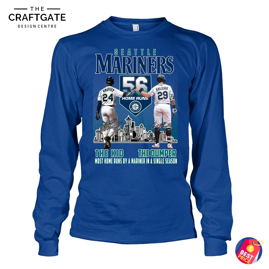 Ignite your Mariners pride and relive legendary moments with the Seattle Mariners 56 Home Run T-Shirt, a true collectible for any dedicated fan. This vibrant royal blue tee proudly showcases a dynamic front-only design that captures an unforgettable era of power hitting. Centered at the top, the iconic “SEATTLE MARINERS” logo is displayed in bold, crisp lettering, framed above the prominent “56 HOME RUNS” graphic featuring the team’s classic compass rose emblem. Below this historic number, two legendary figures are depicted walking away, a powerful tribute to their prowess: Ken Griffey Jr. (#24, “THE KID”) and Cal Raleigh (#29, “THE DUMPER”). Each player’s image is accented with their respective jersey number and nickname, with digitally simulated autographs beneath. A striking silhouette of the Seattle skyline grounds the design, connecting these heroes to their city. The message “MOST HOME RUNS BY A MARINER IN A SINGLE SEASON” proudly proclaims the achievement. Crafted from a premium 5.3 oz. pre-shrunk 100% cotton fabric, this crew-neck t-shirt offers both comfort and durability for everyday wear.