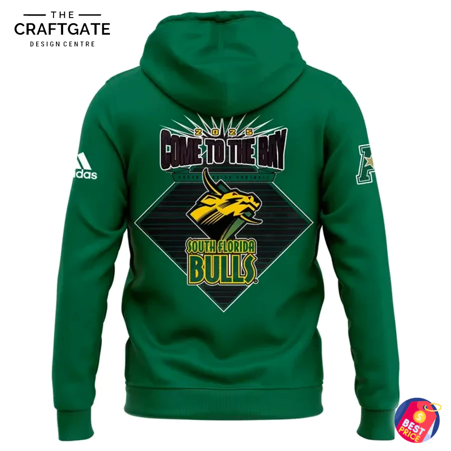 Ignite your unwavering spirit for the Bulls with the exclusive South Florida Bulls football 2025 Robo Bull Limited Hoodie, a symbol of your dedication to the green and gold! This premium collectible instantly connects you to the electrifying energy of game day. The front proudly features the iconic South Florida Bulls logo, a fierce bull’s head rendered in striking gold, black, and white, perfectly centered above the bold “SOUTH FLORIDA BULLS” text in matching team colors. On the left sleeve, the classic “A” emblem is subtly embroidered, while the adidas logo graces the right sleeve. Turn heads with the dynamic back design, showcasing “2025” and the powerful phrase “COME TO THE BAY” above a striking diamond graphic. Within this emblem, the same menacing Robo Bull head and “SOUTH FLORIDA BULLS” text are featured, making a bold statement. Crafted from a luxurious 80% cotton, 20% polyester blend fleece, this mid-weight hoodie (approx. 8.5 oz/yd²) offers superior comfort and warmth, perfect for those brisk Florida evenings or stadium chills.