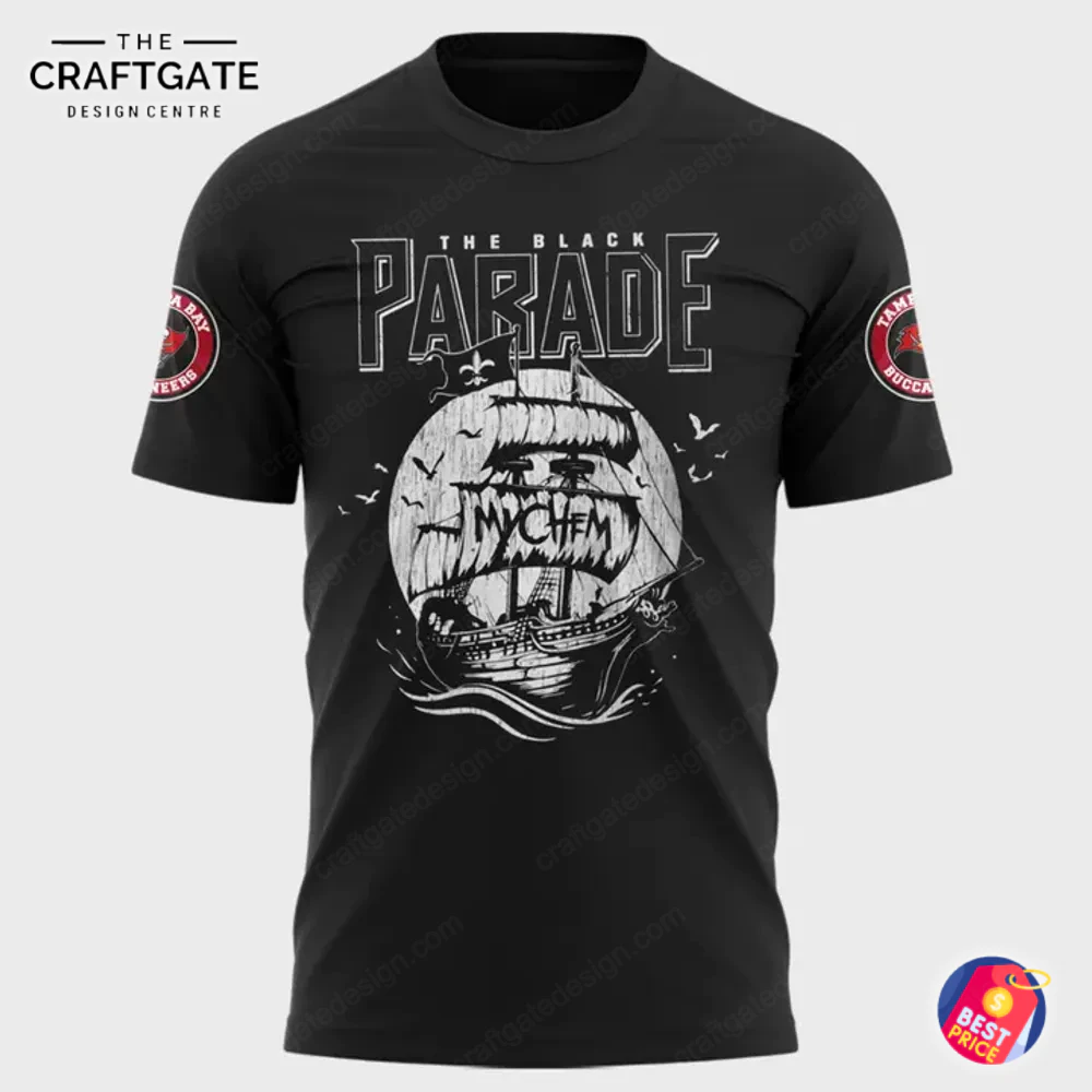 Feel the roar of the crowd and the pulse of the music with the exclusive Tampa Bay Buccaneers x My Chemical Romance Tour 2025 T-shirt. This ultimate collectible fuses your passions. The front features a dramatic pirate ship, synonymous with the Buccaneers, sailing under “THE BLACK PARADE” banner with “MY CHEM” subtly on the sail, all in stark white on a premium black background. The back boldly declares “LONG LIVE THE BLACK PARADE!” in distressed lettering, showcasing a fierce skull peering from inside a Buccaneers helmet. Official team emblems adorn both sleeves. Crafted from soft, breathable 100% pre-shrunk cotton, this mid-weight tee ensures lasting comfort.